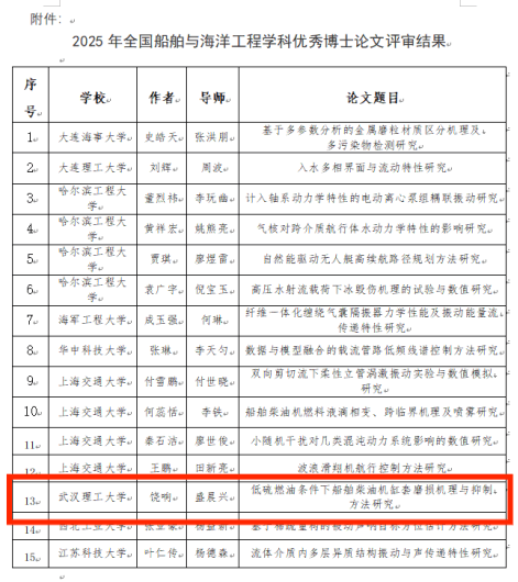 近日,中国造船工程学会2025年全国船舶与海洋工程学科优秀博士学位论文评选结果揭晓,全国共评选出优秀博士学位论文15篇。公司饶响博士(导师:盛晨兴教授)的学位论文成功入选。